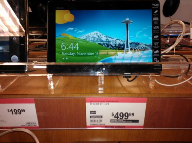 MicroCenter? No convertibles. After walking around the store twice I’m convinced there are no Windows tablets either. Then I’m walking by a table displaying Android tablets and I see one of them lit up with the Windows 8 lock screen. No signage lets you know that it is a Windows 8 tablet. In fact, you can’t even tell what model it is unless you know that a TF600T is an ASUS VivoTab RT. No I did not know, I looked it up. F.